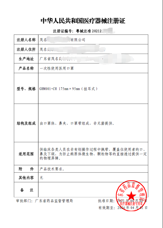 一次性使用醫(yī)用口罩注冊證