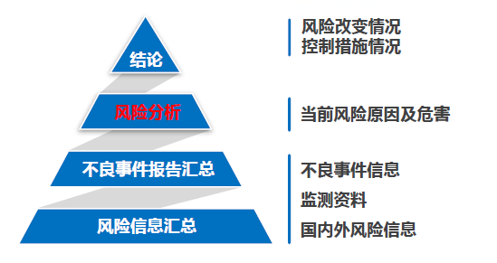 3、評價 對風險信息的匯總; 對不良事件監(jiān)測信息進行的分析 對其他風險信息的綜合 對上市后風險的評價:風險是否有變化、是否可接受 4、報告 報告應當:完整、規(guī)范化;有邏輯結(jié)構(gòu)(介紹、數(shù)據(jù)、分析、結(jié)論);可識別(日期、版本、注冊人與聯(lián)系人等);